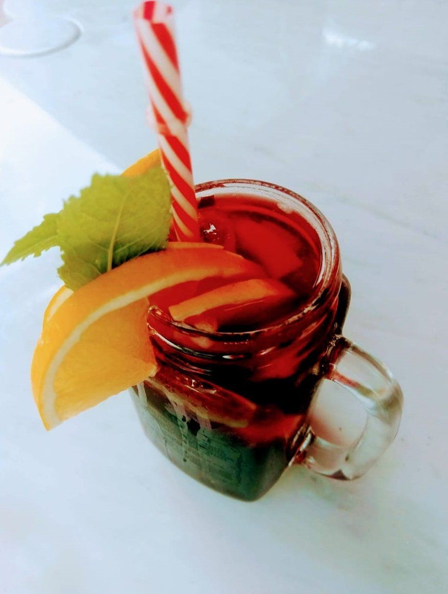 5 cl DOMMSAU, bis zur Hälfte auffüllen mit Merlot, mit Zitronenlimo auffüllen, Eiswürfel, Orangenscheiben, Minze